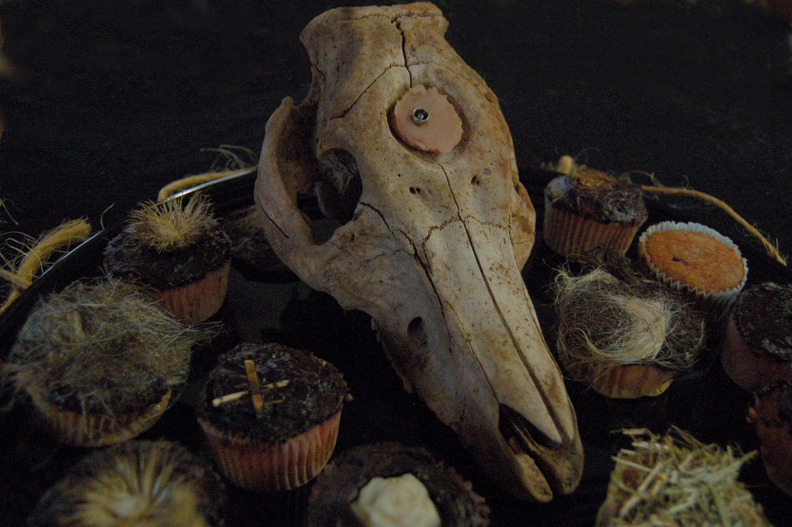 The Picnic buffet table also featured a display of disturbing cupcakes provided by the Rural Alchemy Workshop. These cupcakes were watched over, as if guarded or maybe heralded, by the skull of a sow bearing the remains of a strange experimental implant. We know this much: this sow in her lifetime was involved in an experimental study that measured metabolic responses of the porcine body to various chemicals injected directly into her brain tissue through the implant. The ultimate goal of this experiment (in the context of funded animal-science research at a major American university) was to figure out ways to get the pigs fatter, faster and on less feed.
