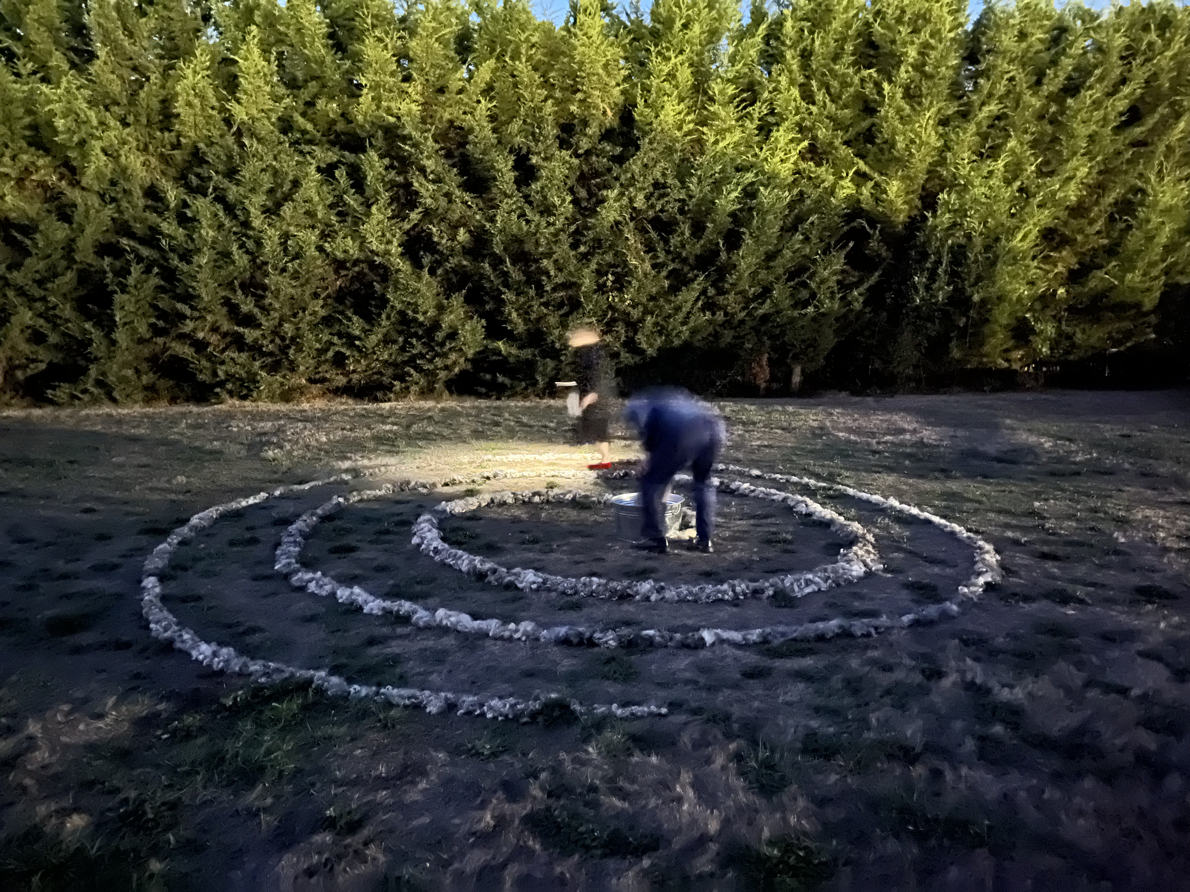 Evaporation Day, Yard Work at Living Studios. Installation of spiral made of raw wool from three sheep residing at the Rural Alchemy Workshop (Amitza, Marble, and Rocket). Evoking the rim around the last remaining water in the R.A.W. pond on Evaporation Day in early summer, this spiral of the same raw wool welcomes back the water from wherever it has been since it last passed through here.